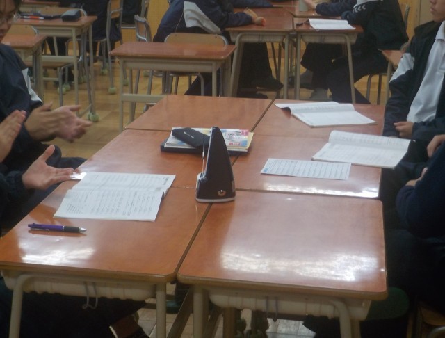机上では、グループごとに、メトロノームに合わせて手拍子の練習をしています。