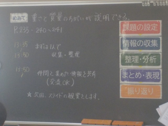 授業のめあては、「重さと質量のちがいが説明できる」です。