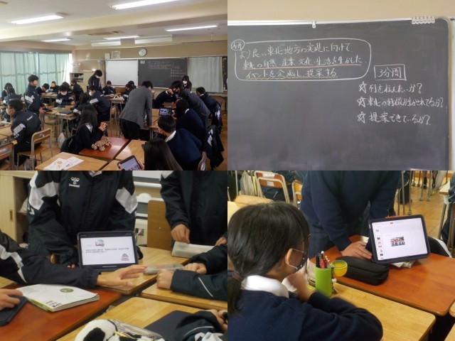 「より良い東北地方の実現に向けて、東北の自然、産業、文化、生活を生かしたイベントを企画し、提案する」を研究テーマに、グループごとに3分間で、プレゼンテーションを行います。