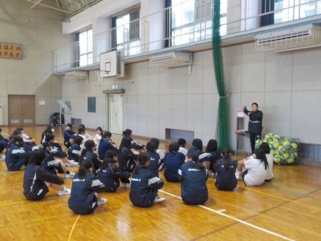 「6m間隔のパス練習」「サーブ練習」「グループ練習(チームで試合で勝つための練習」⇒見通しを持つ