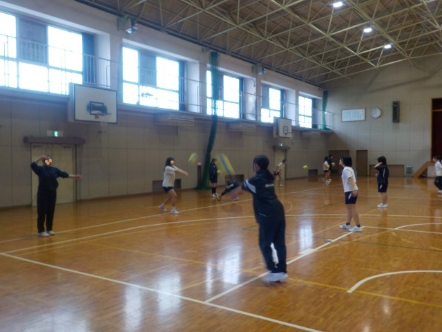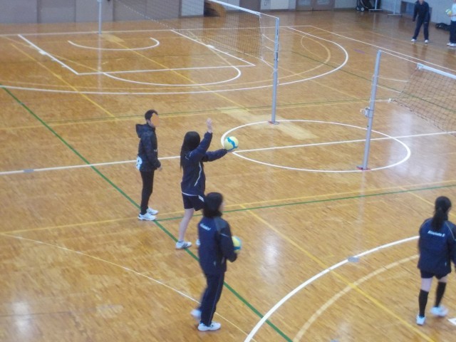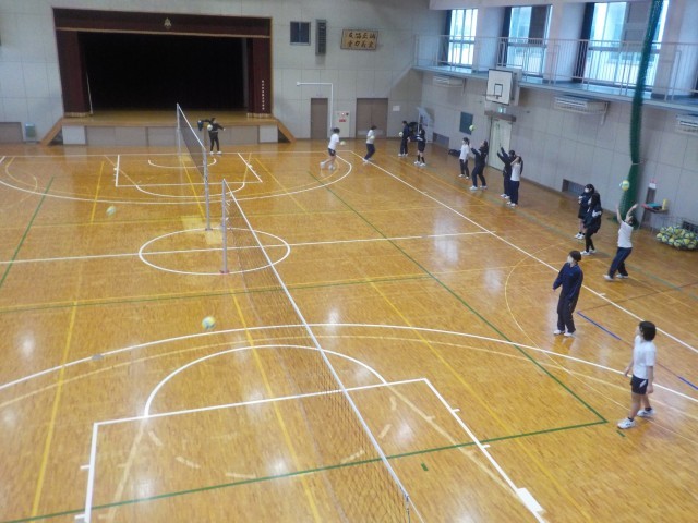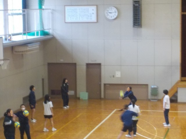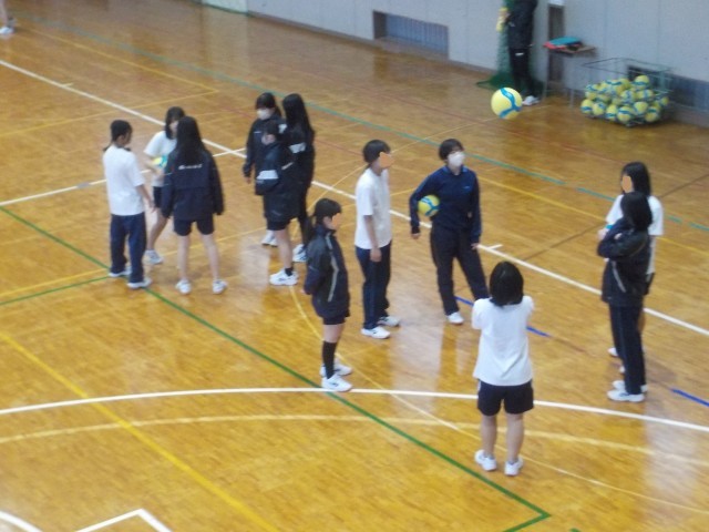 ・ボールなげ、両手でのボールのたたきつけ、レシーブ練習が段階的に行われていた。(生徒主導で実施)