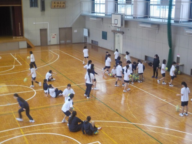 説明後、一人一個ボールを持って、練習開始です。(写真中)