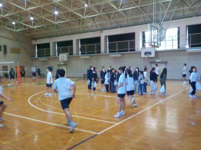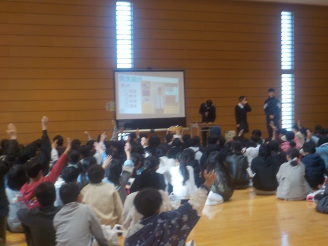 初めに武道場でオリエンテーションが行われ、生徒会の皆さんから学校生活の紹介が行われました。