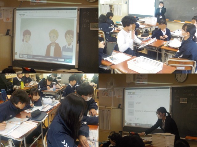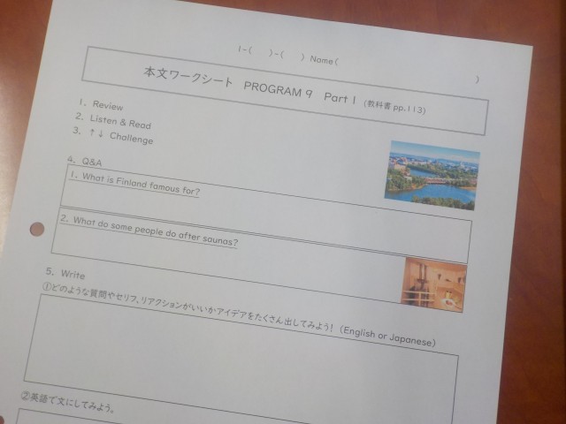 ・本文ワークシートと教科書の関連を確認しながら、今日のめあて「フィンランド人の家にあるものについて理解し最後の文につづくセリフや質問を考えることができる」につなげていた。(改めて、めあてが意識できた)