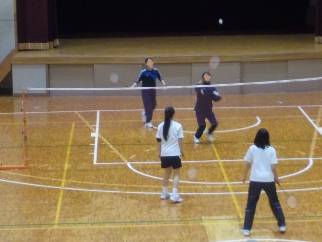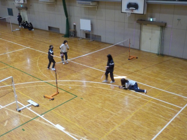 女子は、体育館でバドミントンのゲームに取り組んでいます。