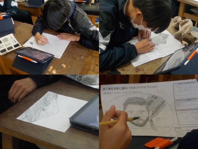 墨の濃淡の技法で味わいのある作品を完成させます。