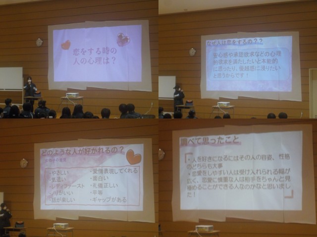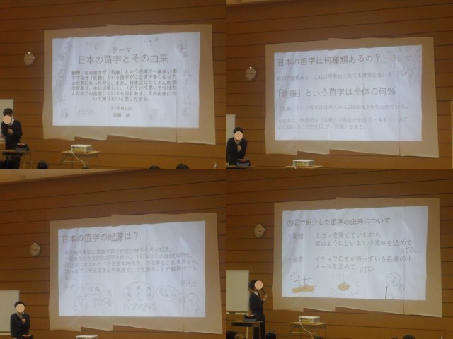 今日は、3年生の生徒の前で、各クラスから投票で選ばれた4人の生徒による発表が行われました。