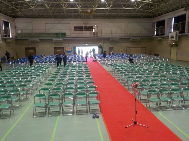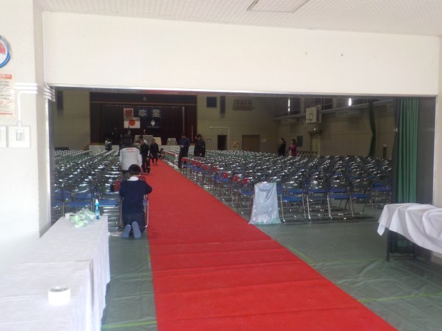 ご覧のようにレッドカーペットを敷いたり、椅子を並べたり、卒業式の雰囲気が感じられる体育館内になってきました。