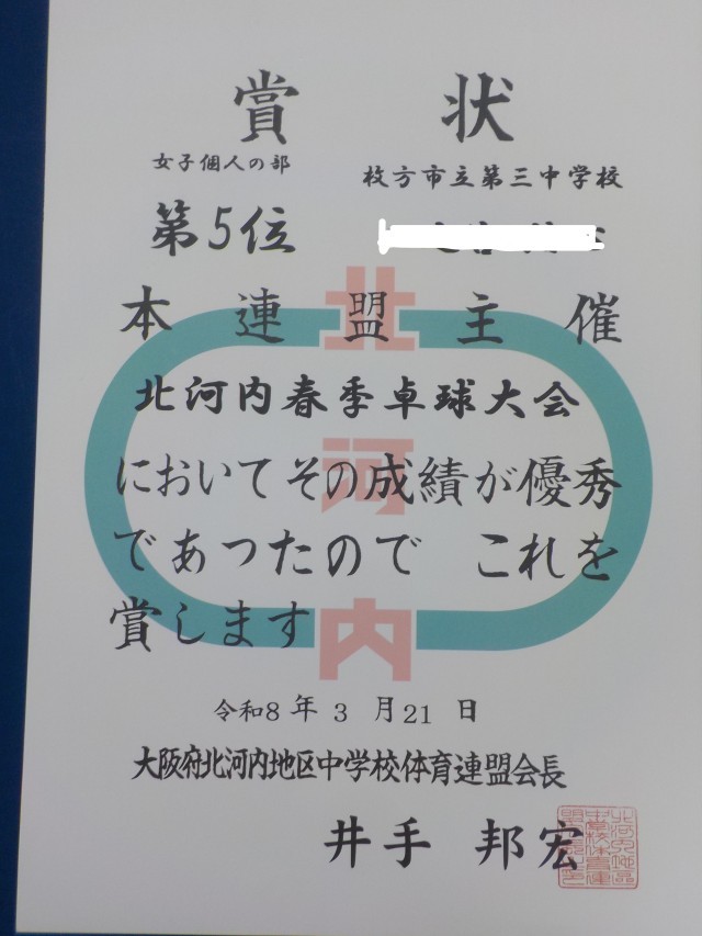 北河内春季卓球大会 女子個人の部 第5位