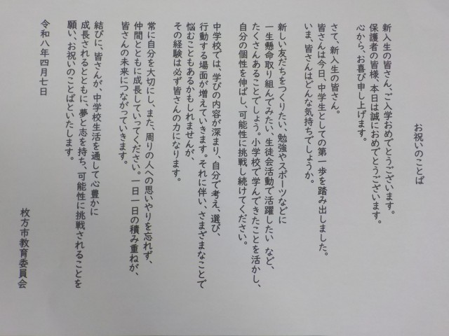これから始まる中学校生活にむけて、激励のメッセージをいただきました。