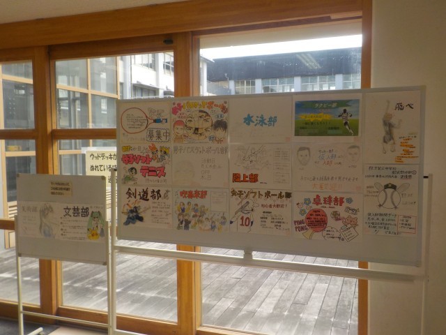玄関付近には、各クラブの勧誘ポスターも用意されています。