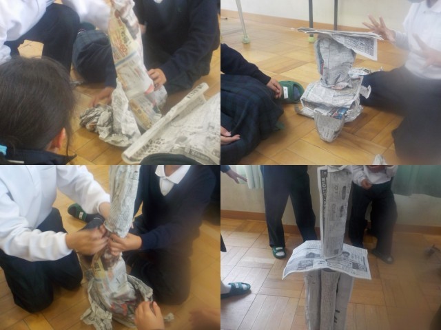 新聞紙をつかって、高い形のものを作る取り組みです。