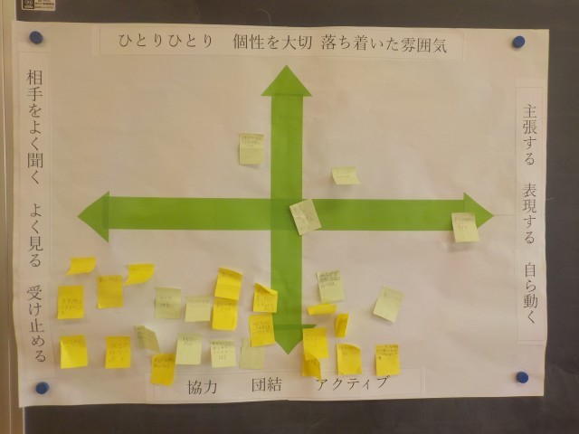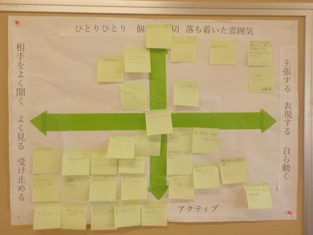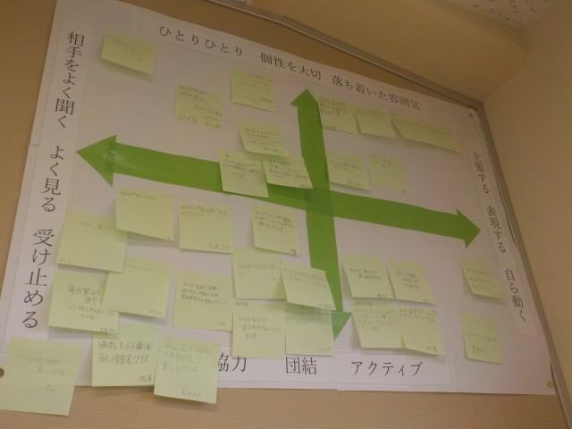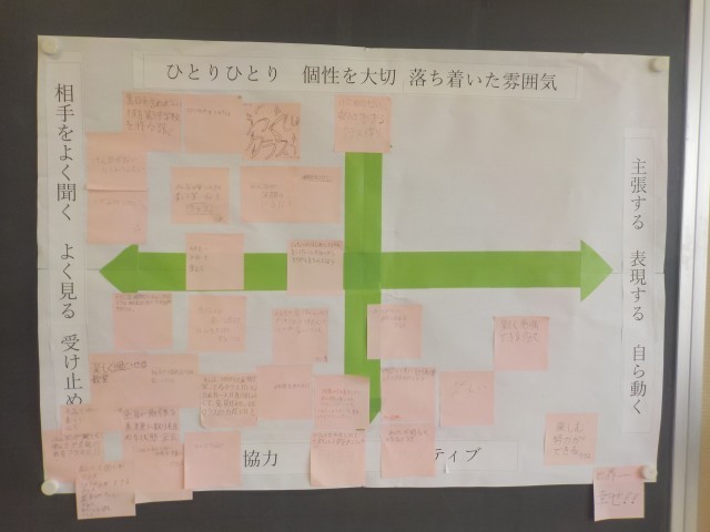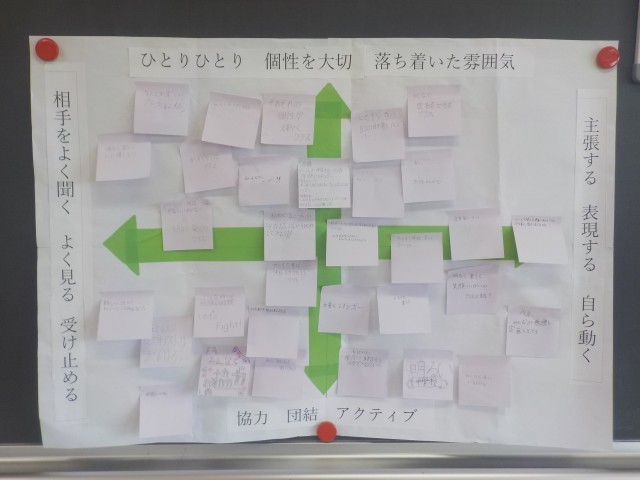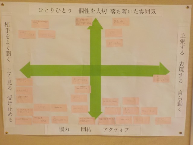 1年生の各クラスでは、どんなクラスにしていきたいのか(学級目標)について、心のマップをつかって、検討が行われました。