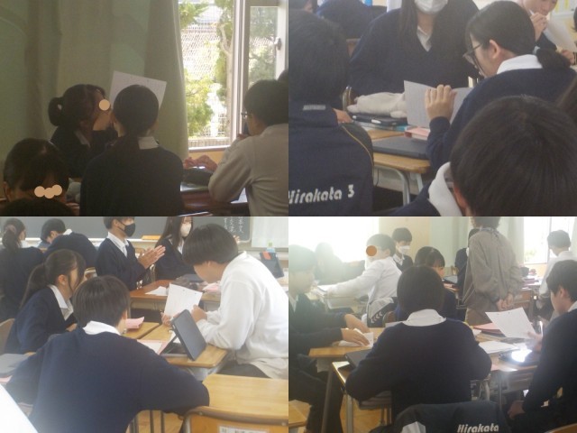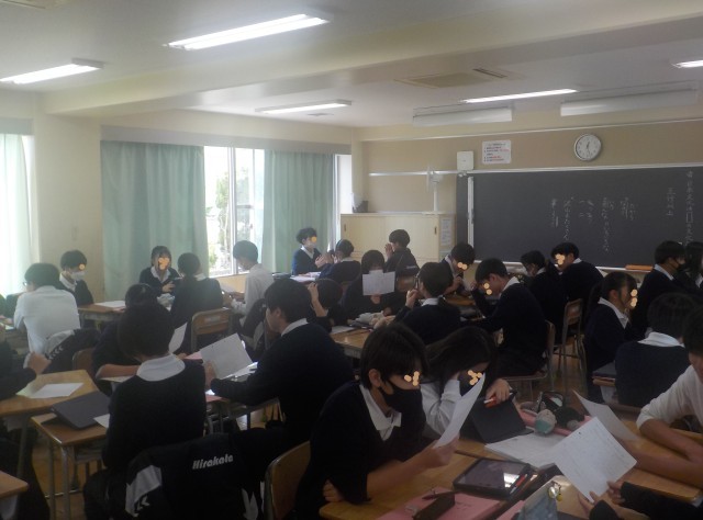 学習プリントを示して、グループ内の生徒に伝えています。