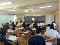 2年3、4組女子の保健の授業です。この時間は、交通事故の危機予測と回避について学びました。自転車に乗っている時に起こりえることを、グループで活発に意見交流をしていました。