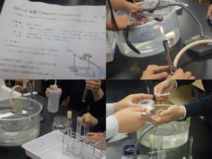 班ごとに協力して、実験の取り組みが始まりました。何度も相談を重ねて実験が進んでいきました。(写真下)