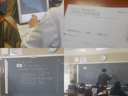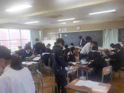 「乗法、除法ができる」が授業のめあてです。生徒間の交流が活発です。