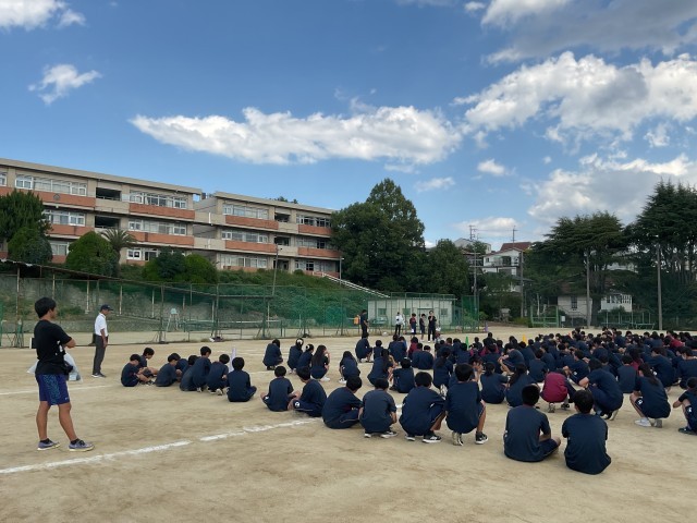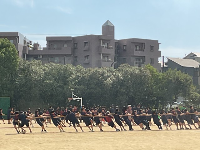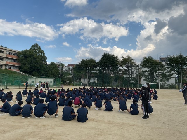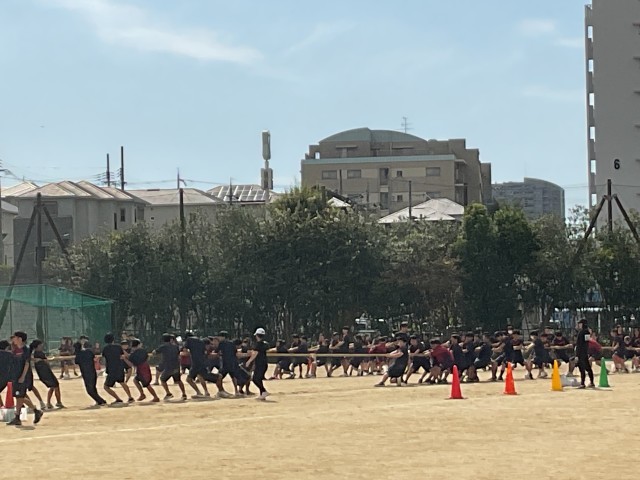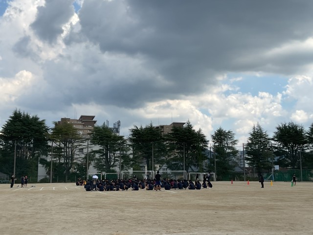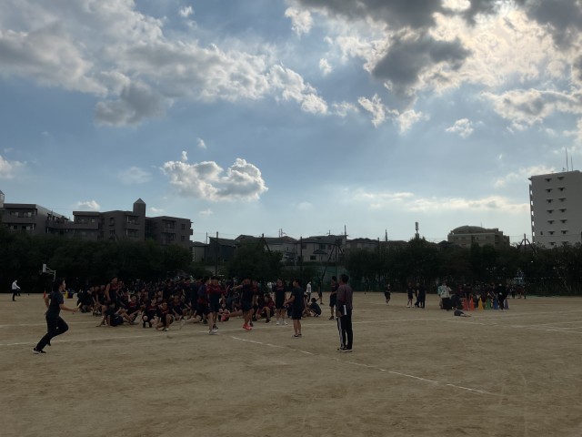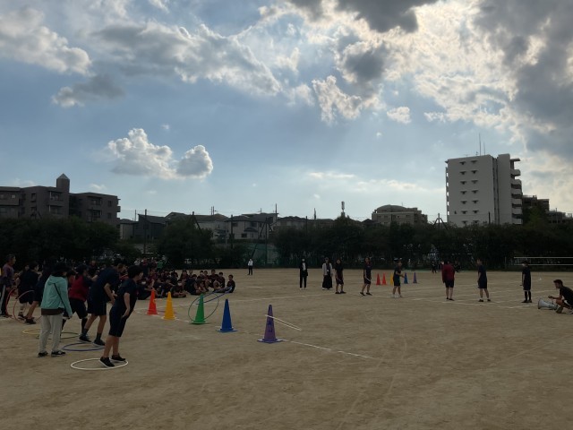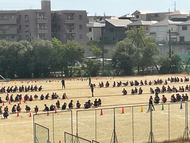 体育祭の学年練習の様子です。学年種目については学年ごとにクラス(ブロック)対抗で競います。学年種目は全員リレーと学年ごとの種目があります。今年度は、3年生は「ローハイド(騎馬リレー)」、2年生は「クロネコのツナ(綱引き)」、1年生は「増えるリレー(⚪︎人⚪︎脚)」です。写真は、3年生は全員リレー、2年生は綱引き、1年生は⚪︎人⚪︎脚後を終えた後の振り返りの様子です。