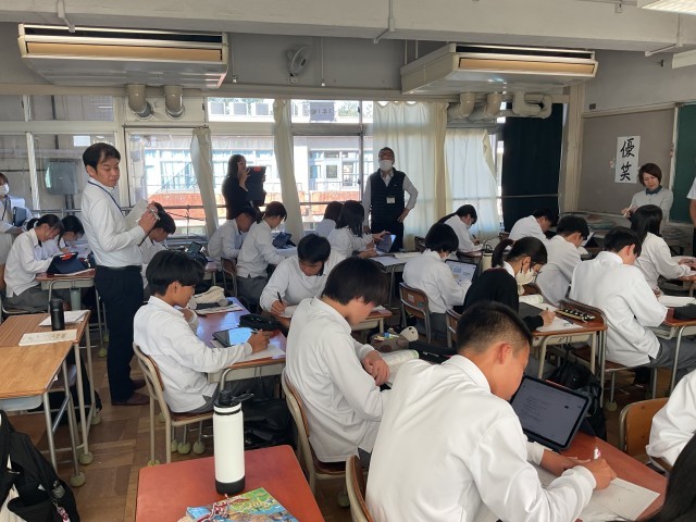 生徒参加型の校内研究授業を実施しました。3年生の全クラスで国語・社会・数学・理科・英語・体育の教科で実施しました。校区内の小学校(開成・五常・山之上)からも多くの先生方が参加してくださいました。教育委員会からも指導主事やプランナーも来校されました。授業後には参観した学習委員の生徒たちと本校教職員が一つのテーブルを囲んで授業を振り返りました。明日からの授業に活かして参ります。