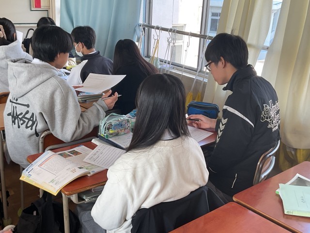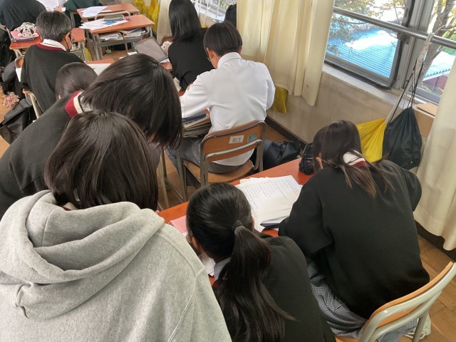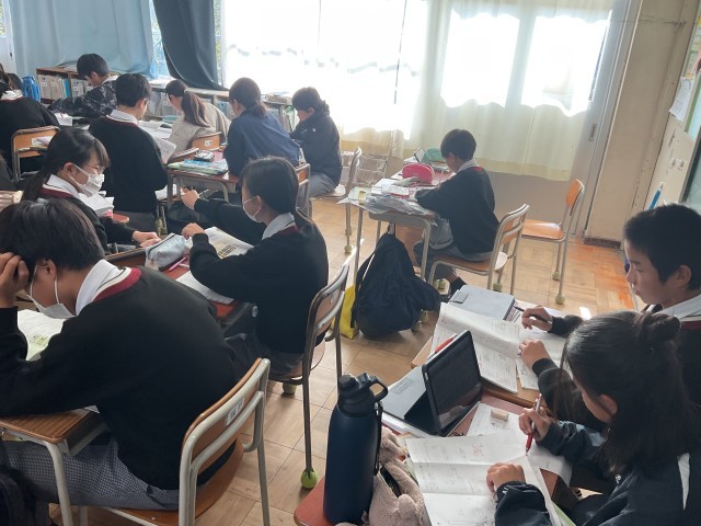 授業中の様子です。いよいよテスト一週間前です。黙々と学習に励む姿もありますが、自学自習の時間には助け合っている場面もたくさん見かけます。みんながんばれ!