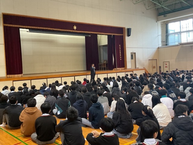 終業式の様子です。校長からは『LINK6』の「コミュニケーション力」を題材に話をしました。生徒指導担当からは「地域でのルールやマナー」について話をしました。冬休み中、生徒の皆さんには有意義な時間を過ごしてほしいと思います。3学期に皆さんの元気な姿が見れることを楽しみにしています。
