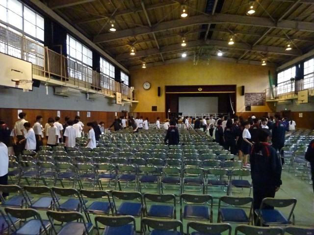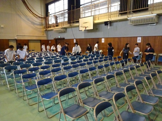 明日のカルスポ祭文化の部のため、放課後に生徒会本部や学活委員、文化委員、美化委員など多くの人たちで会場準備を行いました。明日の皆さんの発表が楽しみです。