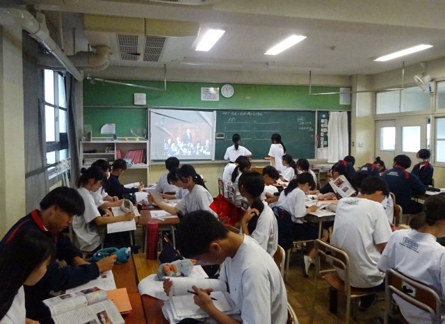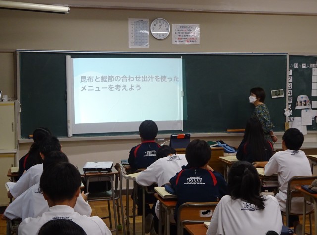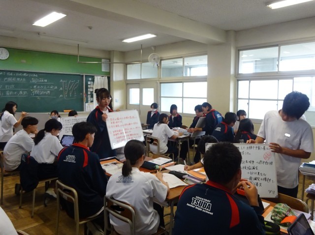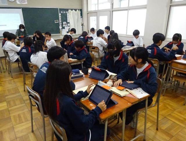 3年6組の社会の授業は、国会と行政の関りについて、グループ毎に課題についてまとめて説明をし合っていました。2年3組の家庭科の授業では、調理実習に向けて、昆布と鰹節の合わせ出汁を使ったメニューをグループで考えていました。