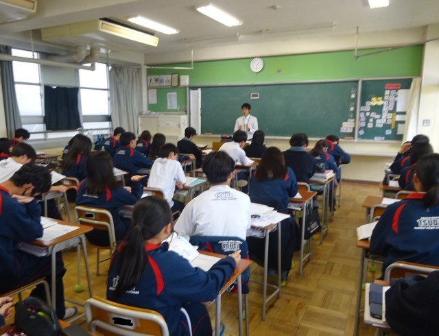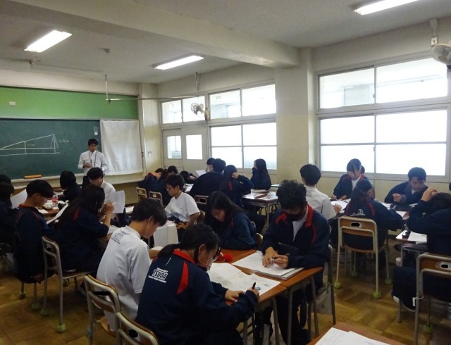 3年5組の数学の授業は、相似を利用して、生活の中で実際の高さや距離を求める問題に取り組んでいました。