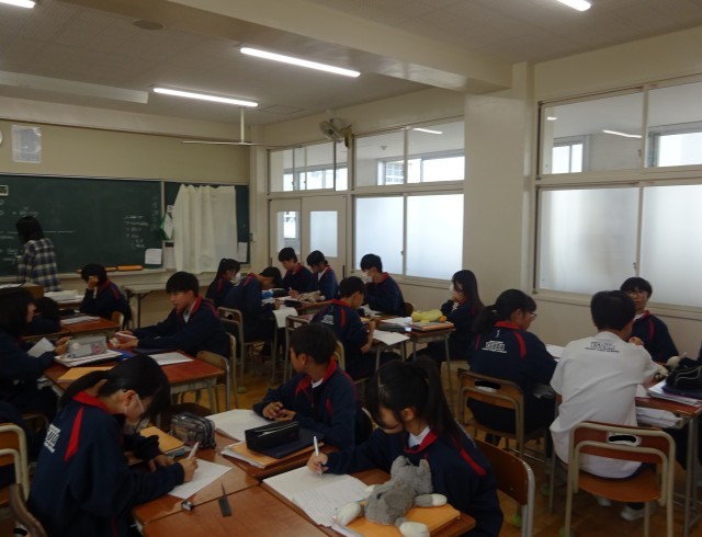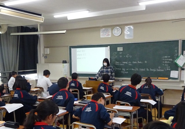 2年5組の英語の授業は、新出英単語のプリントを使って全体とペアで音読した後、疑問詞について学習していました。