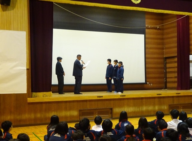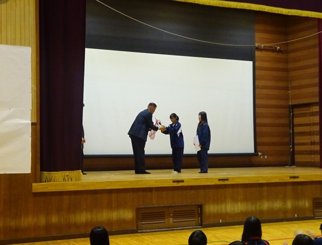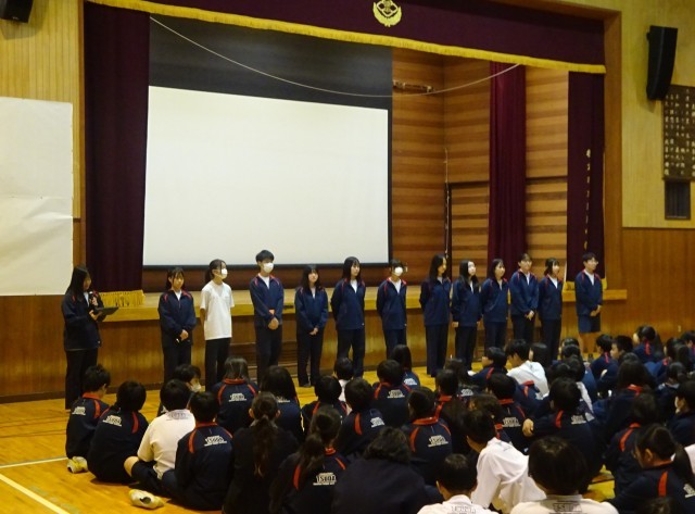 昨日に生徒会役員選挙があり、今日は旧生徒会役員が最後の生徒集会を行いました。一年間で経験したことなど、一人ひとりが振り返った思いを話していました。一年間、お疲れ様でした。