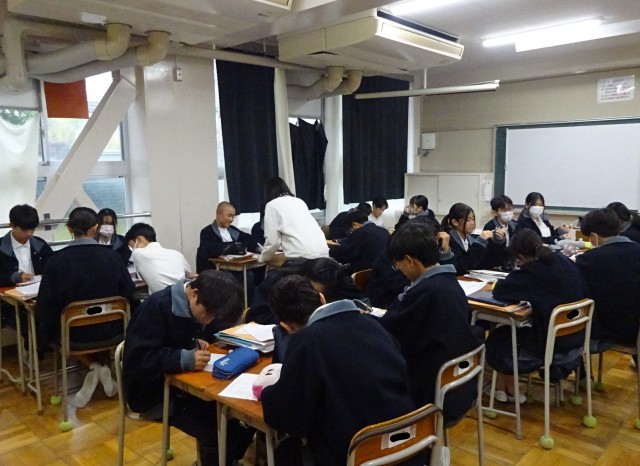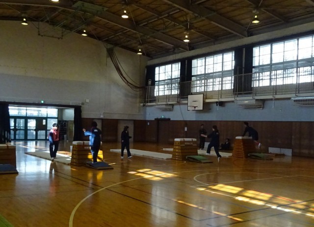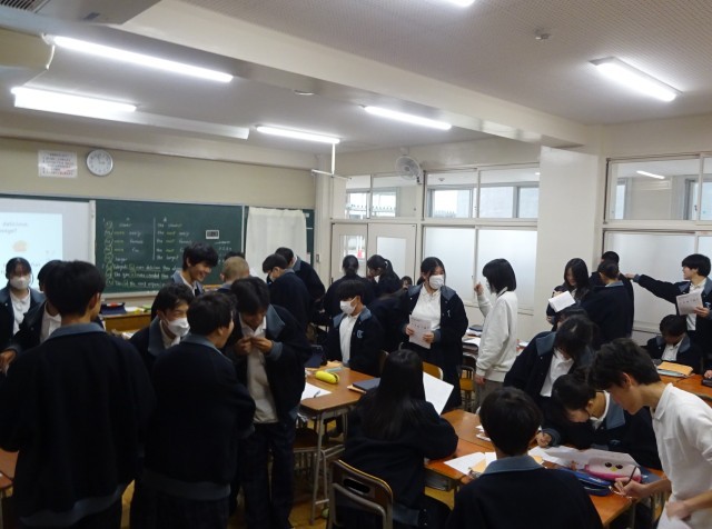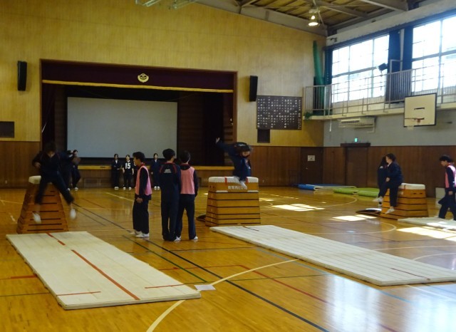 2年3組の体育の授業は、とび箱運動です。高さの違う4ケ所に分かれて開脚とび、閉脚とび、台上前転をしていました。補助をしたりアドバイスを送ったり協力しながら取り組んでいました。2年2組の英語の授業は、比較級と最上級の文法を学習していました。ペアで新しい単語を言い合ったり、移動してたくさんの相手と会話をしたりしていました。