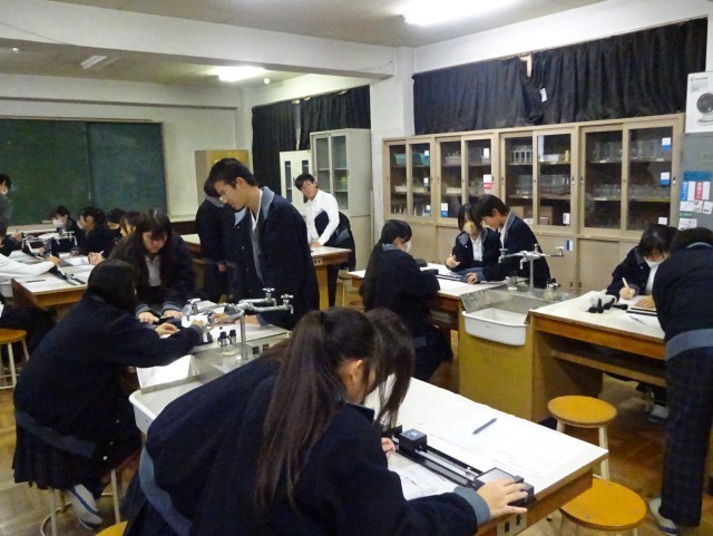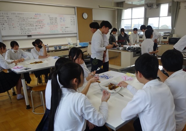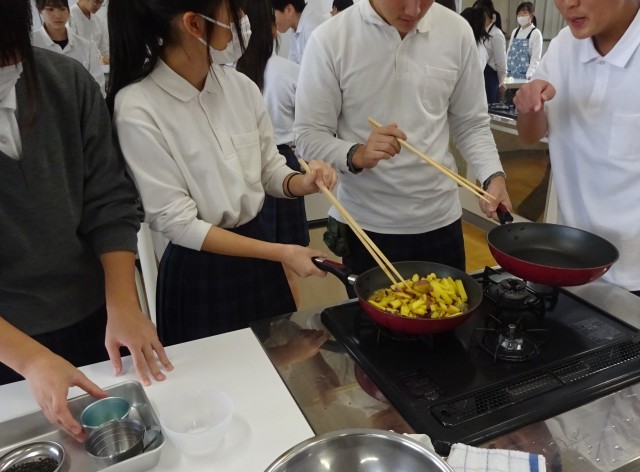 3年2組の理科は理科室で実験です。エネルギーの大きさと物体の高さ・速さや質量との関係を調べていました。1年2組の体育の授業は持久走で、ペアを作ってラップタイムを計測しながら走っていました。3年2組の家庭科の授業では、調理自習で大学芋を作っていました。どの班も出来上がりをおいしく食べていました。