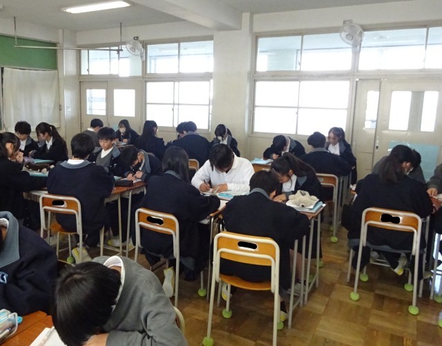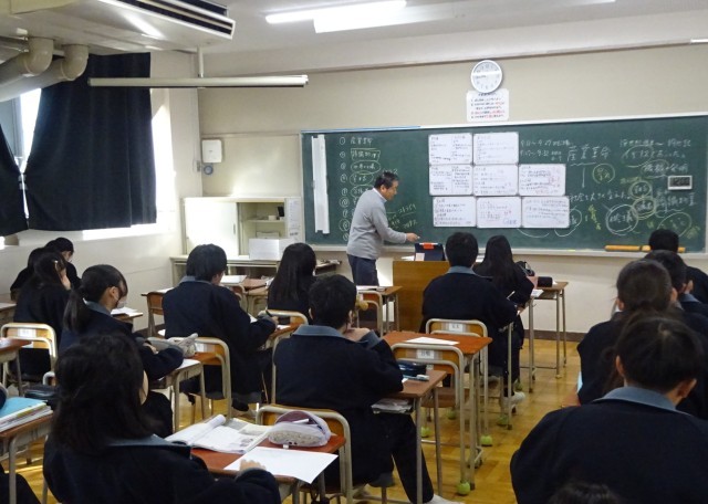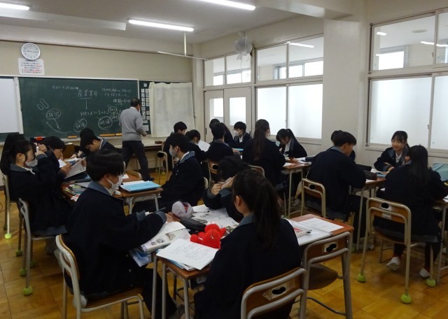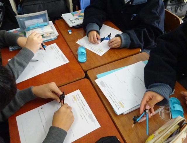 2年4組の社会の授業は、資本主義と社会主義について学習していました。産業革命を動画で理解しながら、その違いについてグループで考えていました。1年1組の数学の授業では、コンパスや定規を使った作図に取り組んでいました。垂直二等分線や角の二等分線、直線の垂線を工夫して使って、問題に向かっていました。
