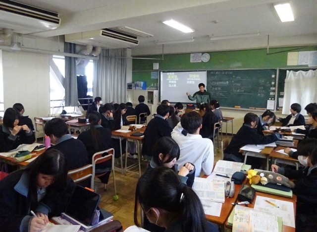 3年2組の社会の授業は、税金の使い道を考える授業でした。いろいろある税金の種類を挙げていました。3年6組の英語の授業では、教科書本文の内容を理解しながら、ペアで音読も行っていました。