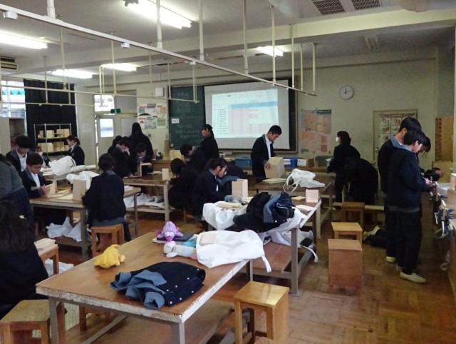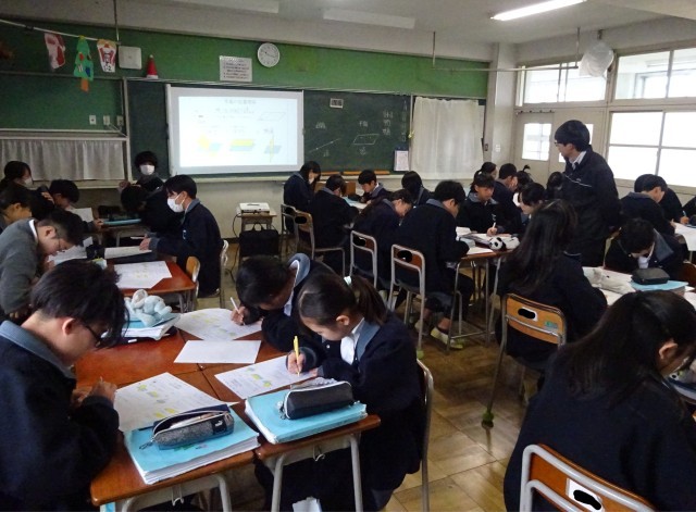 1年2組の数学と技術の授業です。数学は、平面の位置関係について学習していました。技術の時間は、木材加工の製作をしていました。直角度をはかりながら形のきれいなものが出来上がるように取り組んでいました。