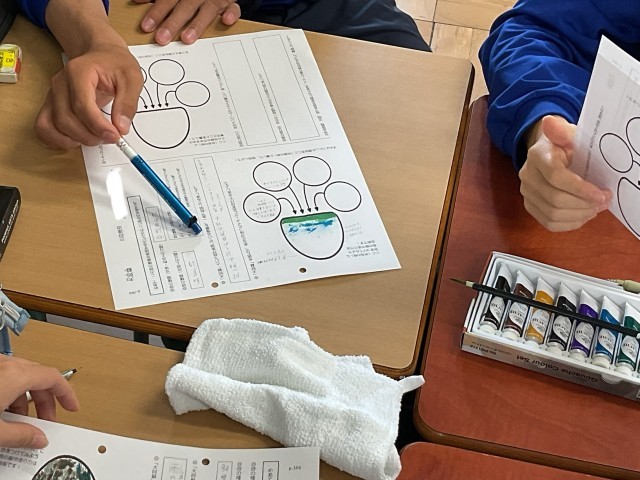 参観した国語の授業では、生徒たちが詩の情景を、アクリル絵の具で表現し、表現の工夫について説明していました。