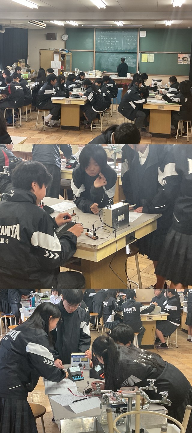 電圧と電流の規則性について、電圧計や電流計を使って実験しています。