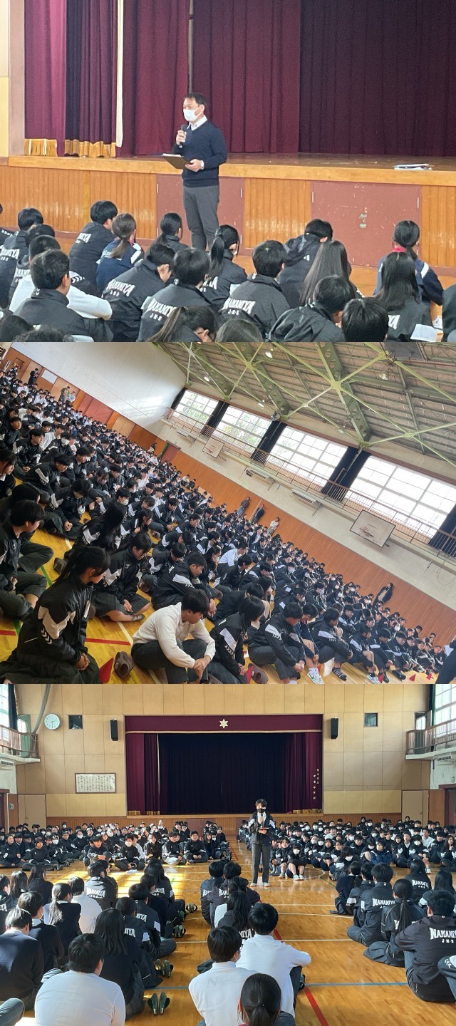 その後、生徒集会を実施し、1、2年生から3年生に向けて、卒業式で着用する胸花の贈呈が行われました。