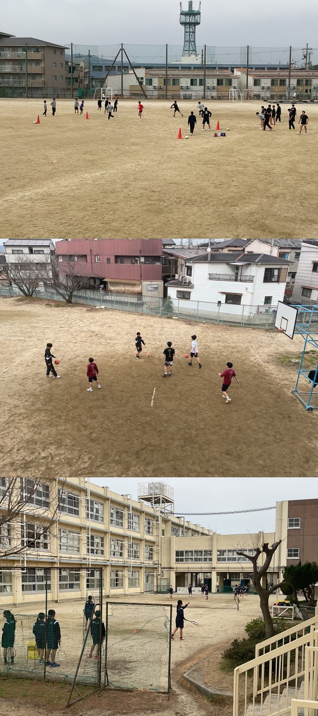 上段はラグビー部、中断は男子バスケ部、下段は女子テニス部の活動の様子です。