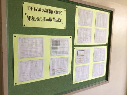 ・1年生の教室棟(北棟)には、数学のゴールデンウィーク中の課題レポートが掲示されています。