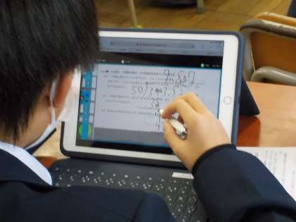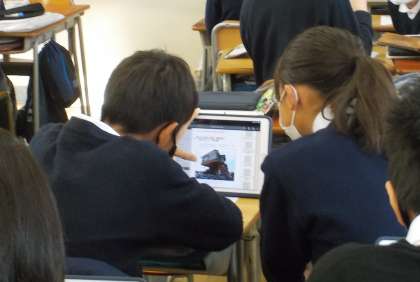 1年生は最後にiPadが配付された学年ですが、様々な形で活用されています。この日の授業はiPadを使ったり、友人と交流しながら、「地震による災害」について調べ学習を行っていました。ペンを使って画面に手書きのメモをしたり、二人で一つの画面を見て交流を図るなど、生徒の皆さんは伸び伸びと授業に取り組んでいました。生まれた時からICT環境が整った中で暮らしてきた年代の吸収力はすごいです。