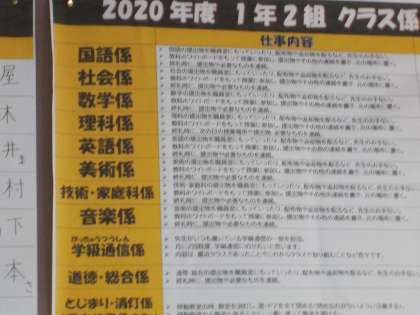 また、教室の後にクラスの役割をまとめた掲示物がありました。カラフルなデザインで仕事内容がコンパクトにまとめられてあり、常に活動内容を意識することができます。パッと見てインパクトのある掲示物は、その都度、自分の活動を振り返ることができます。