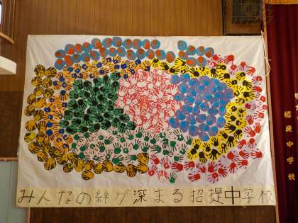 一番内側の緑、赤、青のかたまりが1年生、その周りの橙、黄、緑が2年生、一番外側の青、赤、黄が3年生の手形であることがわかりました。全校生徒の手形が集まり、学校の絆になっています。形に残って、いつでも振り返ることができるので、ふと見るだけで気持ちを穏やかにしてくれます。