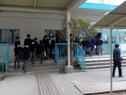 体育館に入る前に生徒の中から、服装を正そう、ボタンを留めようなどの声かけがあり、落ち着いた状態で学年集会が始まりました。