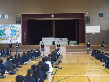 体育館に入る前に生徒の中から、服装を正そう、ボタンを留めようなどの声かけがあり、落ち着いた状態で学年集会が始まりました。