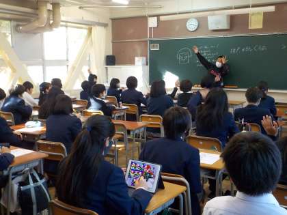 1年1組では、交流を交えながら、今学期の抱負などについて、プリントにまとめていました。教室を見渡すと、iPadを活用して調べる生徒も増えて、少しずつ活用が浸透しつつあります。始業式で聞いた話を早速調べてくれた生徒もいたようです。教室を訪れた時に答えを教えてくれました。疑問に思った時、すぐに調べられるのがiPadの強みでもあります。