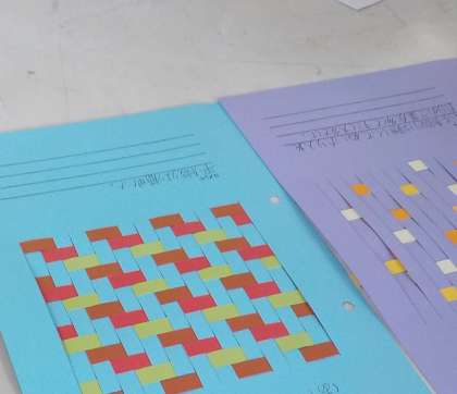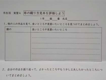 「布の織り方見本」の取り組みも順調に進んでいます。今日の課題は、他の人の作品の良いところを見つけて、自分の取り組みに活かすことです。自分で考えたり、班で意見交流しながら、プリントにまとめていきます。