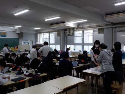 3年生は「レザーコースター」の作製です。この時間はデザインの完成と清書用紙に描くことが目標です。生徒の皆さんは、iPadなども活用して、プリントにデザインを描いていました。一人ひとりの絵には個性があり、その人の人柄が見えるようです。教員も一人ひとりに応じた声かけやアドバイスなどを行っていました。取り組み方法は同じでも完成品は全く違ったものになるのが興味深いところです。