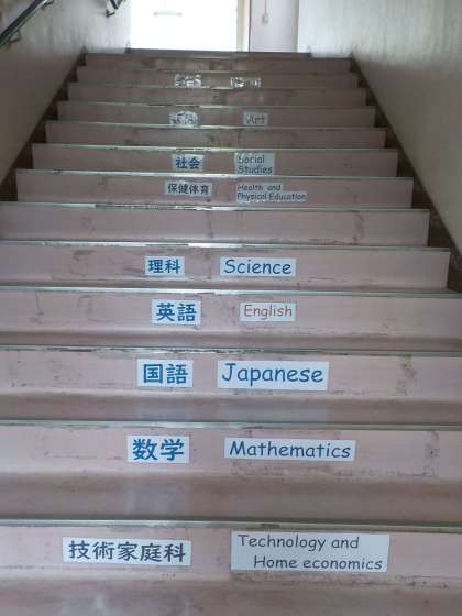 招提中学校の階段には、おもしろい仕掛けがあります。一段昇るごとに英語や中国語を見ることができます。自分の目標を達成するために、自分の部屋やよく見えるところにメッセージなどを貼っておくと自然に目標に向かって取り組む気持ちが高まることもありますが、学校の階段に貼られた英語や中国語なども自然に覚えることができそうです。
