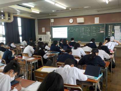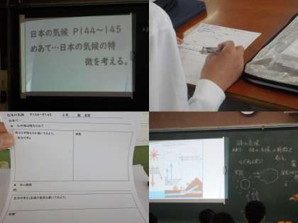 「日本の気候の特徴を考える」が授業のめあてです。生徒の皆さんは、「なぜ、雨がふるのか?」の質問に対して、自分の考えをプリントにまとめていました。まずは、自分でじっくりと考える時間となります。その後、教員と生徒の皆さんとのやりとりが始まりました。教員はホワイトボードにまとめた教材をもとに生徒の皆さんと会話のキャッチボールを始めました。ポイントになる箇所は黒板にまとめていきます。正解を見出す前に自分で考えたり、友人と交流をして仮説を立てることが考える力を養うことになります。この時が貴重な経験になります。